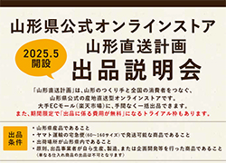 県では、EC市場への県内事業者の参入支援、県産品の販路拡大を図ることを目的として開設した山形県公式オンラインストア「山形直送計画」の出品説明会を12月4日に開催します。出店者の声を紹介するなど、より分かりやすく説明を行いますので、ぜひご参加ください。