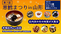 山形市の霞城セントラルで、第7回寒鱈まつりin山形を開催します。 庄内浜の冬の味覚が大集合!魚さばき実演やLiveキッチンもあります。