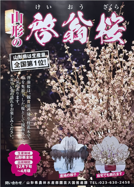 「啓翁桜は、山形県が力を入れている花き品目の一つ」と高橋さん。今年9月に改定された「山形県花き振興計画」では、生産量全国1位の産地を維持するため、さまざまな取り組みを展開しているペロ。