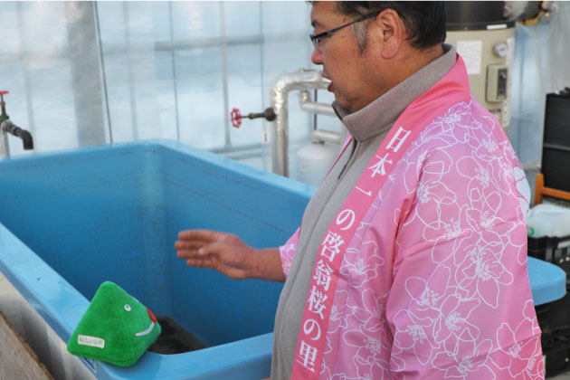 西川町啓翁桜生産組合の組合長・金子光弥さんから促成温室を案内してもらったペロ。促成温室に運ばれた啓翁桜は、大きなお風呂で40℃のお湯に1時間入れ、それからジベレリンという薬剤に浸すんだって。これは、寒さで眠っていた啓翁桜を人工的に目覚めさせる「休眠打破」というペロ。